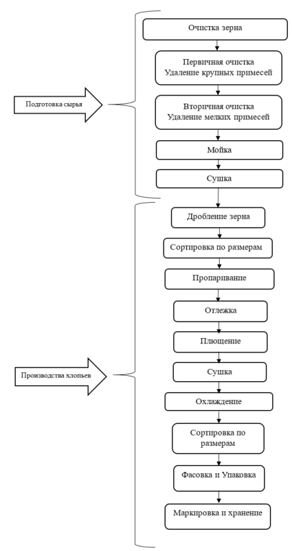 Технологический процесс производства цельнозерновых хлопьев из зерна тритикале включает приемку и контроль качества сырья, его очистку, сушку и калибровку, дробление зерна, гидротермическую обработку (пропаривание) для размягчения структуры, отлежка,  плющение размягченного зерна в хлопья, сушку для удаления излишков влаги и обеспечения хрустящей текстуры, охлаждение для предотвращения конденсации, сортировка по размерам,  а затем фасовку и упаковку готового продукта в тару и маркировка и хранение продукта.
